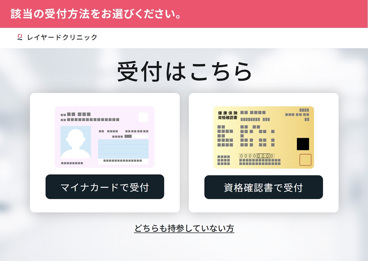 受付機では最初に、マイナンバーで予約を進めるか資格確認書で受付を行うかお選びください。