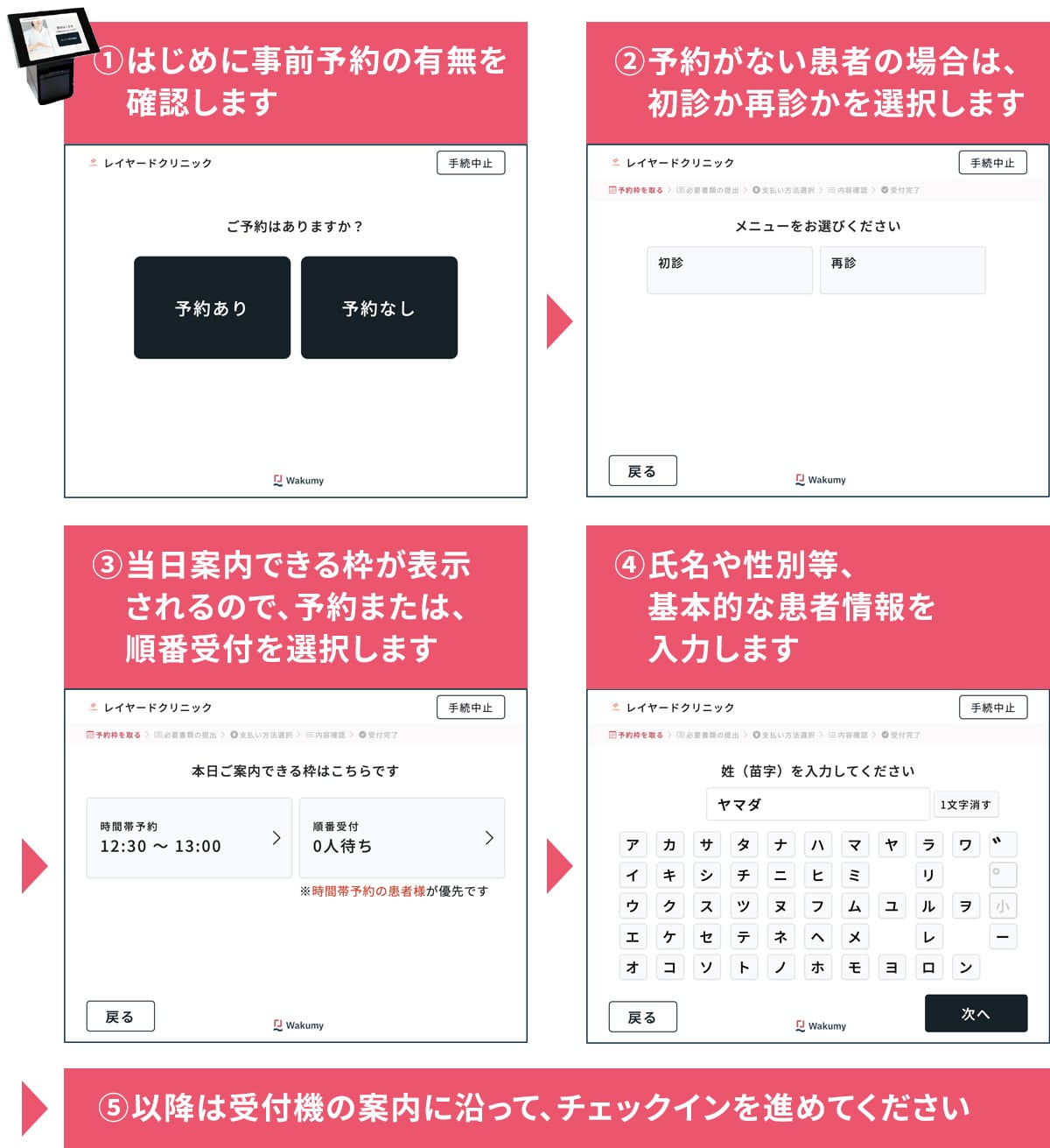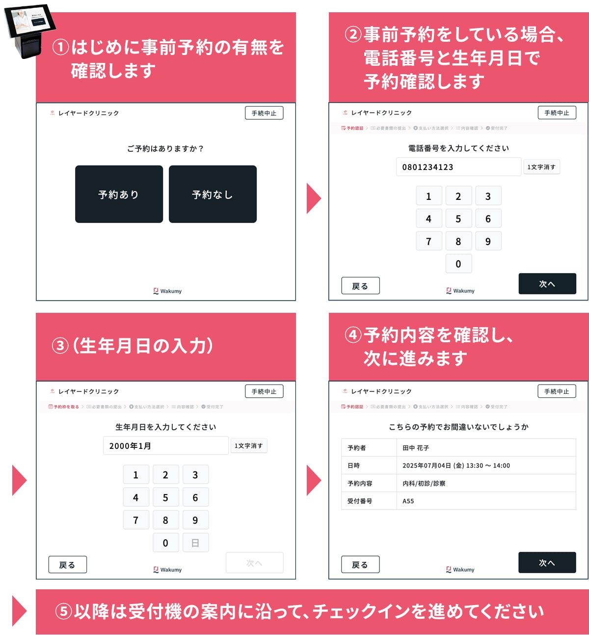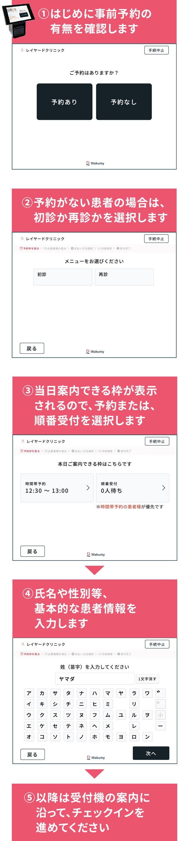 ご来院されましたら、受付機の案内に沿ってチェックインをお願いします。
