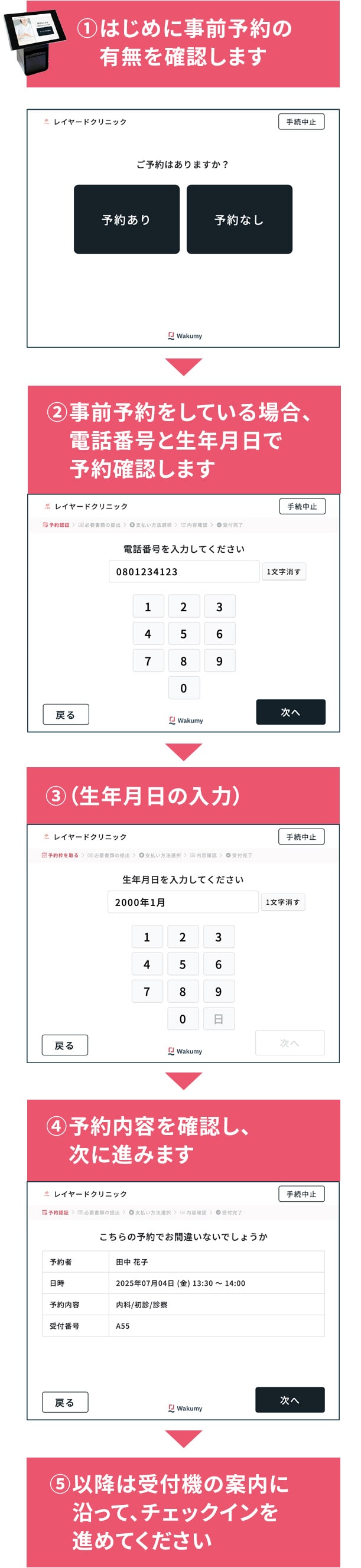 事前予約ありの場合は、受付機に電話番号と生年月日を入力し、予約情報を照会します。
